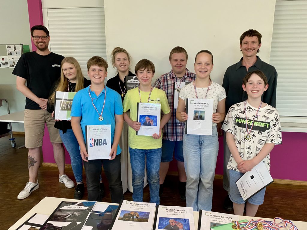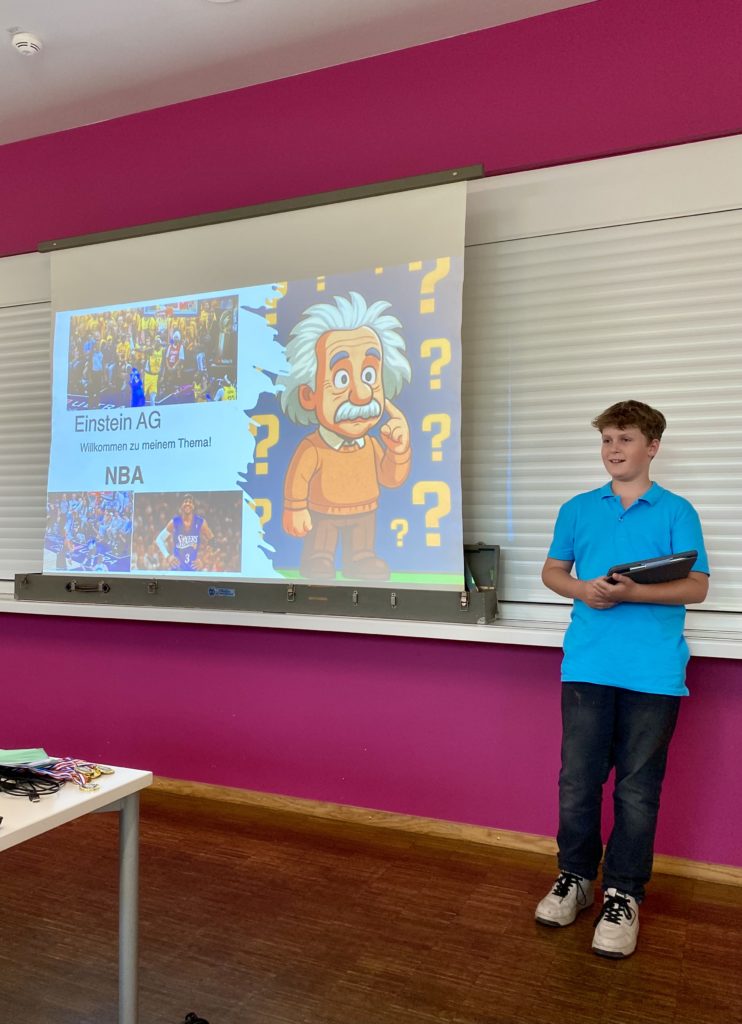 Im Rahmen der Einstein-AG haben Schülerinnen und Schüler aus den Jahrgängen 6-10 ein ganzes Schuljahr lang eigenständig zu selbstgewählten Themen recherchiert und in Kleingruppen engagiert gearbeitet. Dabei entstanden spannende Projekte zu ganz unterschiedlichen Bereichen – von der Galaxie über die Titanic, Lego, der Basketballliga NBA und Betriebssysteme bis hin zu gesellschaftlich relevanten Themen wie Qualzuchten bestimmter Tierrassen und der Kultur der Maya.